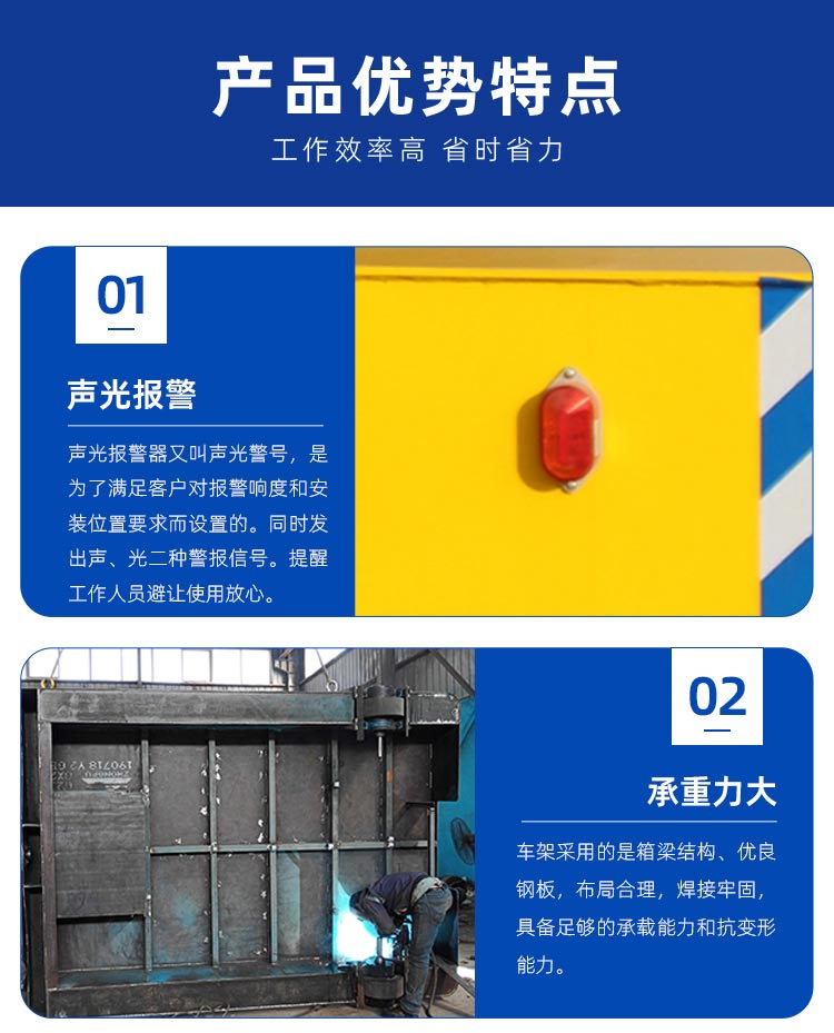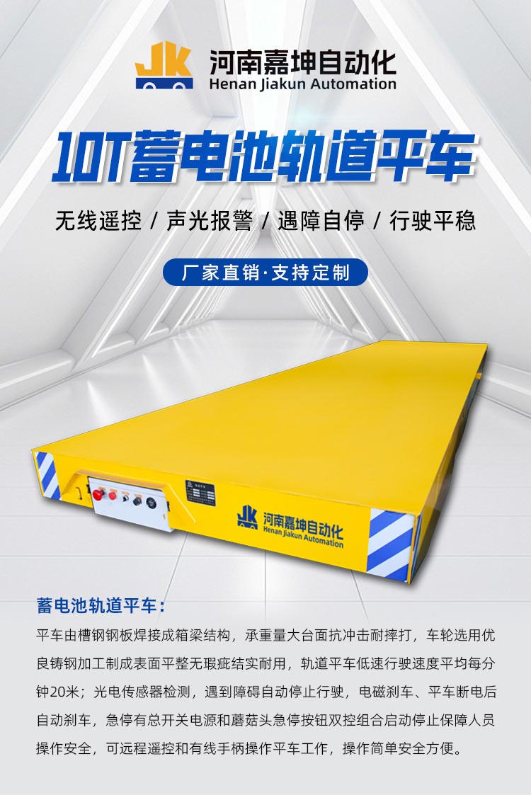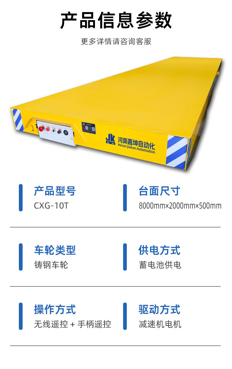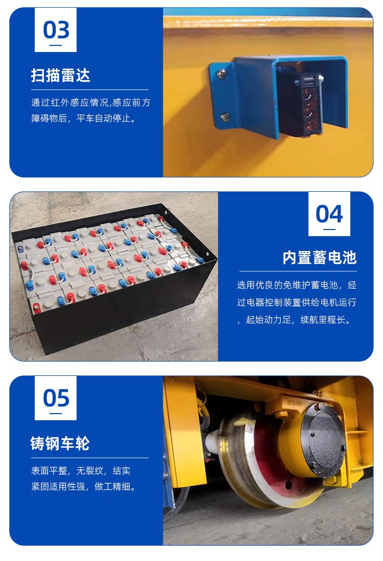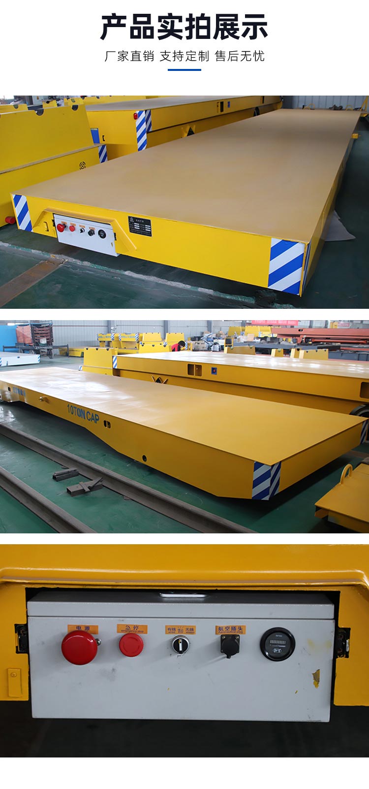 平车由槽钢钢板焊接成箱梁结构,承重量大台面抗冲击耐摔打,车轮选用优良铸钢加工制成表面平整无瑕疵结实耐用,轨道平车低速行驶速度平均每分钟20米;光电传感器检测,遇到障碍自动停止行驶,电磁刹车、平车断电后自动刹车,急停有总开关电源和蘑菇头急停按钮双控组合启动停止保障人员操作**,可远程遥控和有线手柄操作平车工作,操作简单**方便。