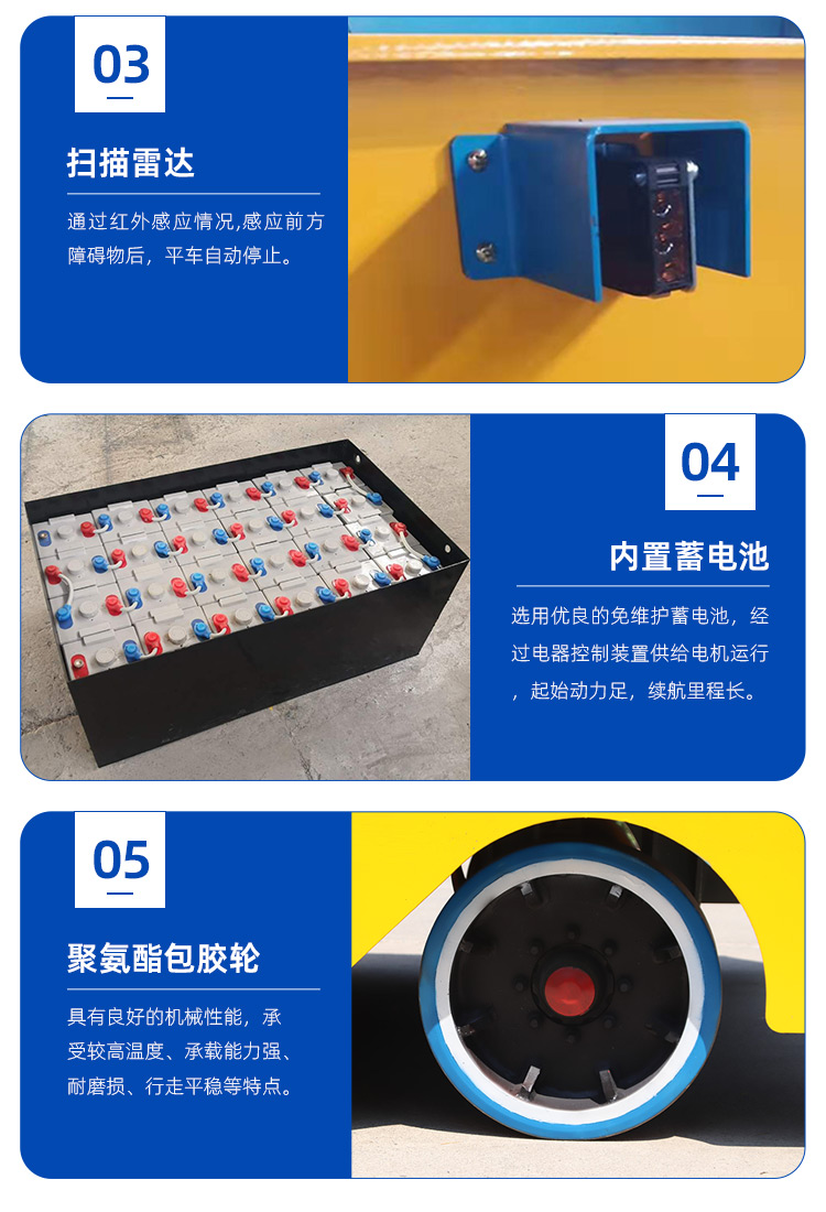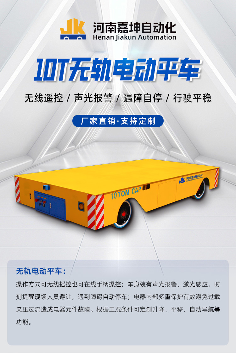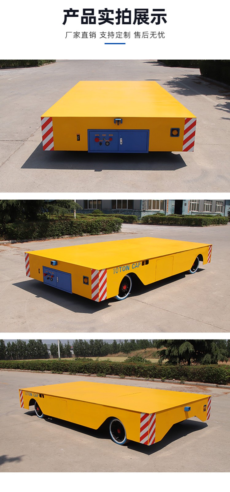 无轨电动平车,通过蓄电池或锂电池供电,运行不受轨道限制, 可在水泥地面、柏油路面、环氧地坪路面上行驶,使用路况不同,配 备车轮也不同,分为箱梁和框架结构,可实现车辆前进、后退、左转、 右转、原地旋转等功能,也可根据客户的需求增加升降、横移、驾驶 位等功能。