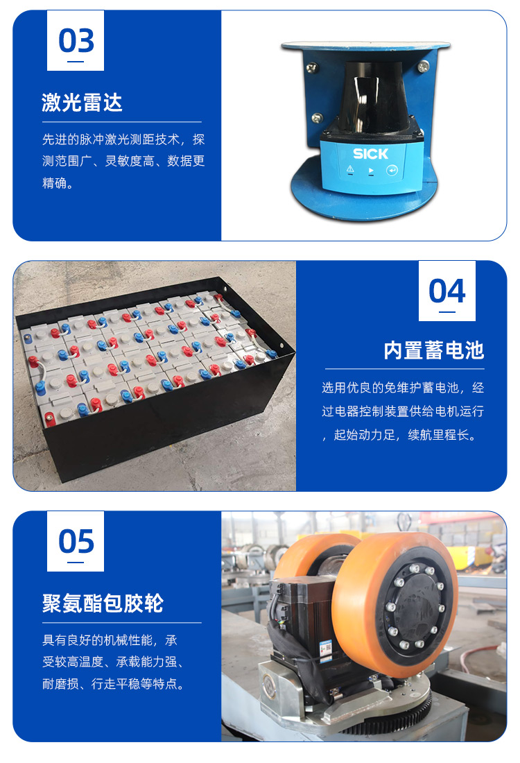 AGV自动化搬运车: 适用于栈板类货物搬运,大大提升了无人搬运的工作效率。可以根据用户需 求设定上下料工位,无需额外人力投入,整个运输过程全程自动化。能够在设定的路线上自动行驶。具有自动避开障碍物功能,保护性能高,在工业应 用中不需要人员驾驶。常常被用到铁路、港口、仓储、跨车间、跨厂房等场 所中,该设备可以减轻人们劳动强度,提高搬运工作的效率。