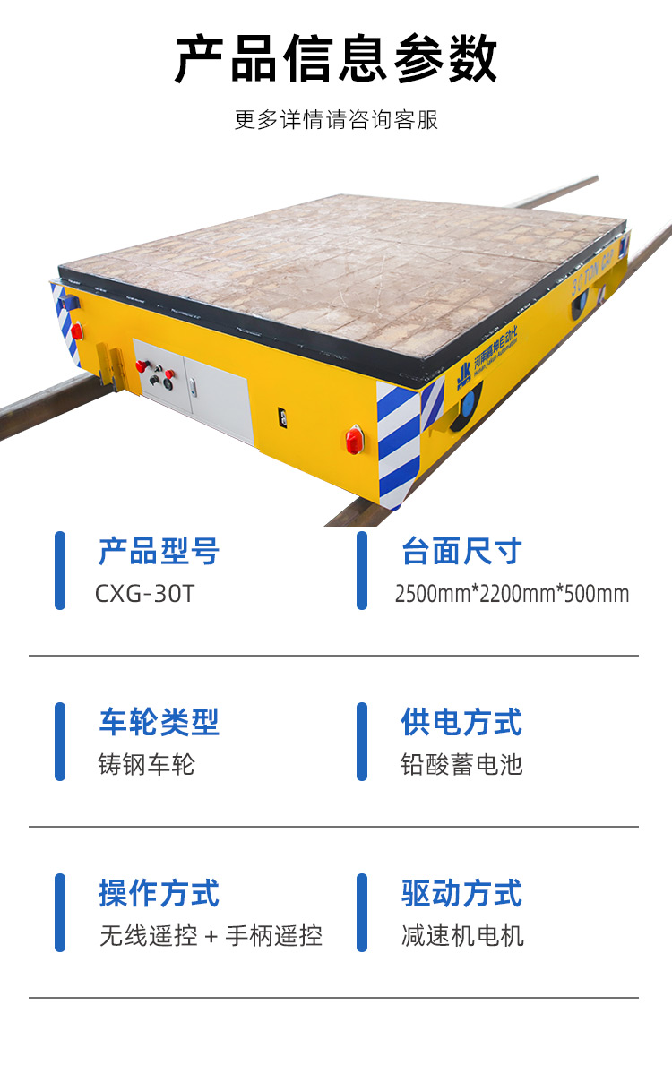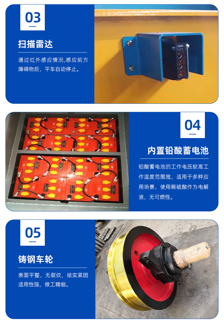 内置免维护铅酸蓄电池供电,经逆变器变换成220V交流电机和传动减速机 驱动平车行驶,平车由槽钢钢板焊接成箱梁结构,承重量大台面抗冲击耐 摔打,车轮选用优良铸钢加工制成表面平整无瑕疵,轨道平车低速行驶速 度**高每分钟20米;光电传感器检测,遇到障碍自动停止行驶,电磁刹车、 平车断电后自动刹车,操作简单**方便。