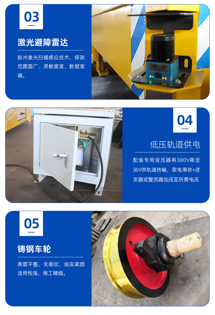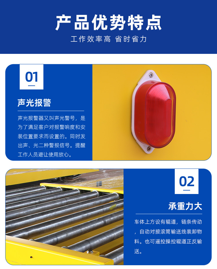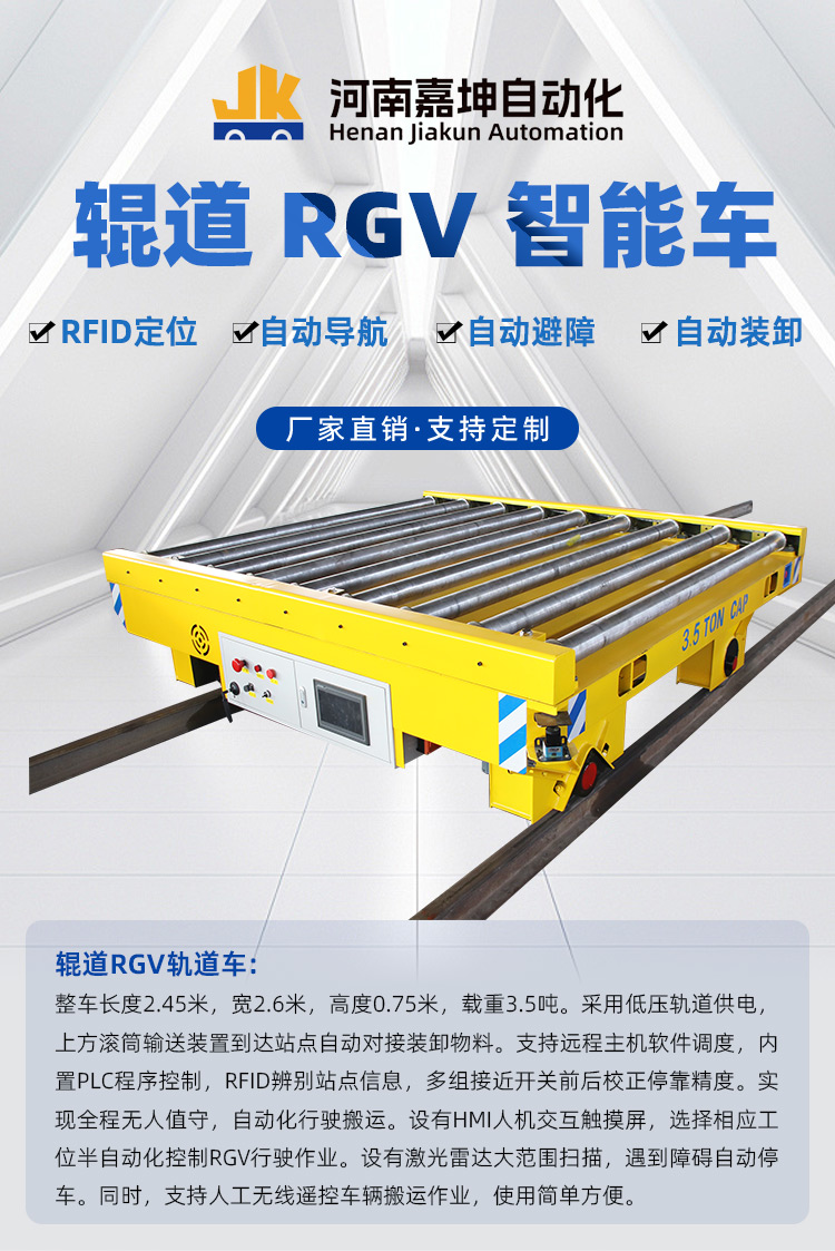 滚筒输送RGV自动搬运车,整车长度2.45米,宽2.6米,高度0.75米,载重3.5吨。采用低压轨道供电,上方滚筒输送装置到达站点自动对接装卸物料。支持远程主机软件调度,内置PLC程序控制,RFID辨别站点信息,多组接近开关前后校正停靠精度。