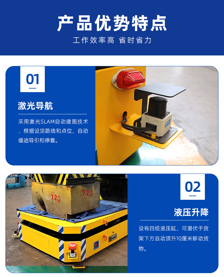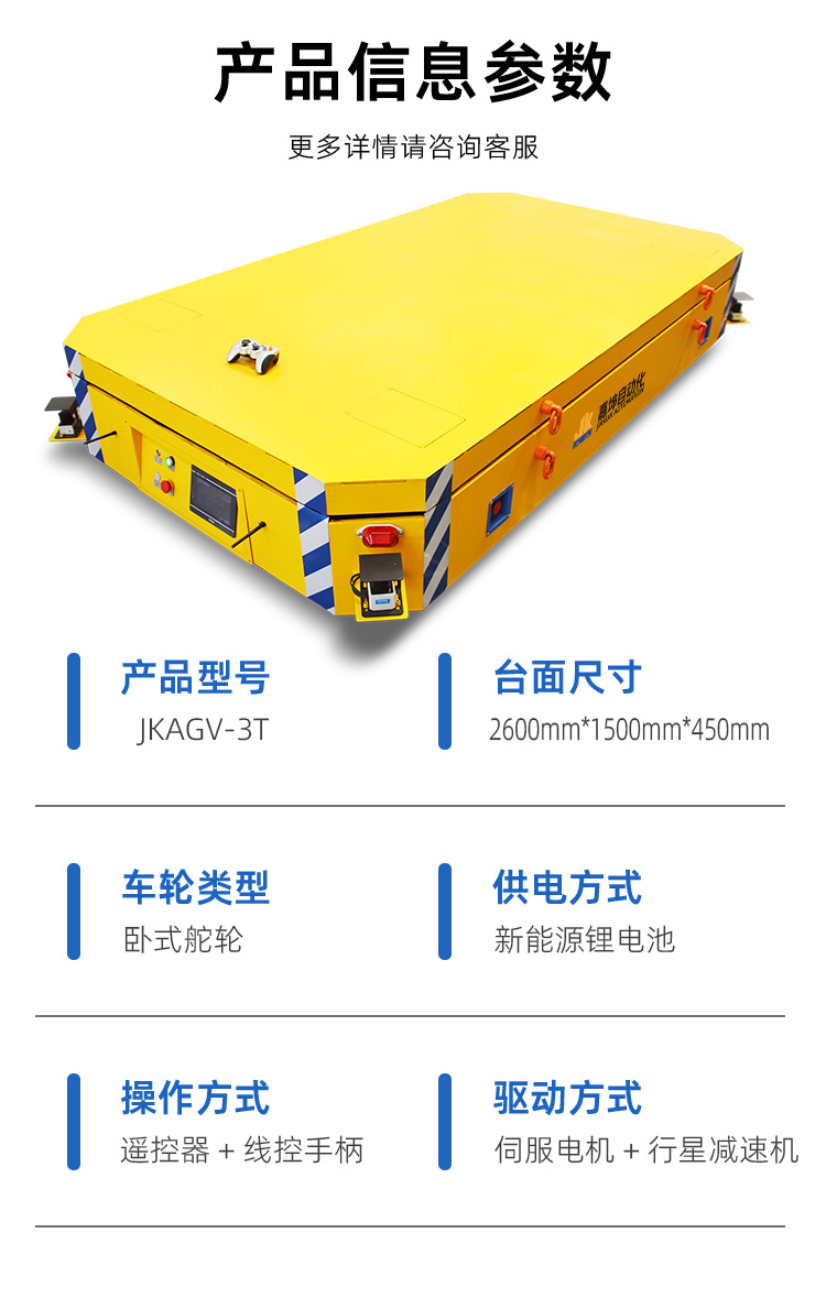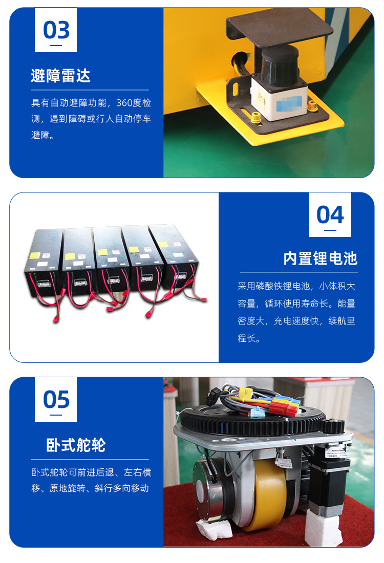 整车长度2.6米1.5米宽,高度45厘米,载重3吨。客户用于汽车自动化生产线装配使用。内置PLC编程支持选择多个工位自动呼叫或到达。设有四组液压缸,可潜伏于货架下方自动顶升10厘米移动货物。采用激光SLAM自动建图技术,根据设定路线和点位,自动循迹导引和停靠。