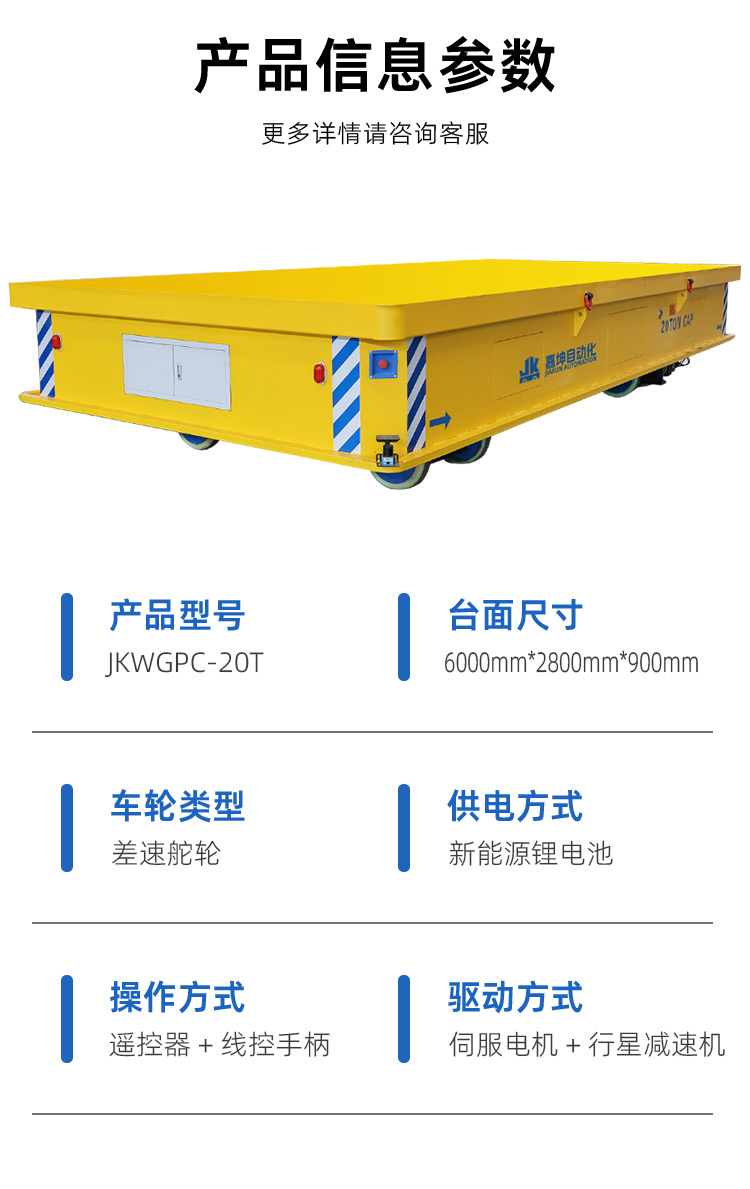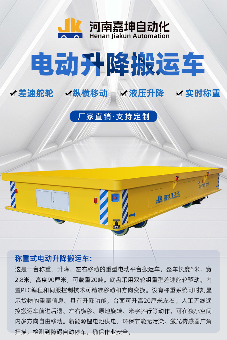 这是一台称重、升降、左右移动的重型电动平台搬运车,整车长度6米,宽2.8米,高度90厘米,可载重20吨。底盘采用双轮组重型差速舵轮驱动。内置PLC编程和伺服控制技术可精准移动和方向变换。设有称重系统可时刻显示货物的重量信息。