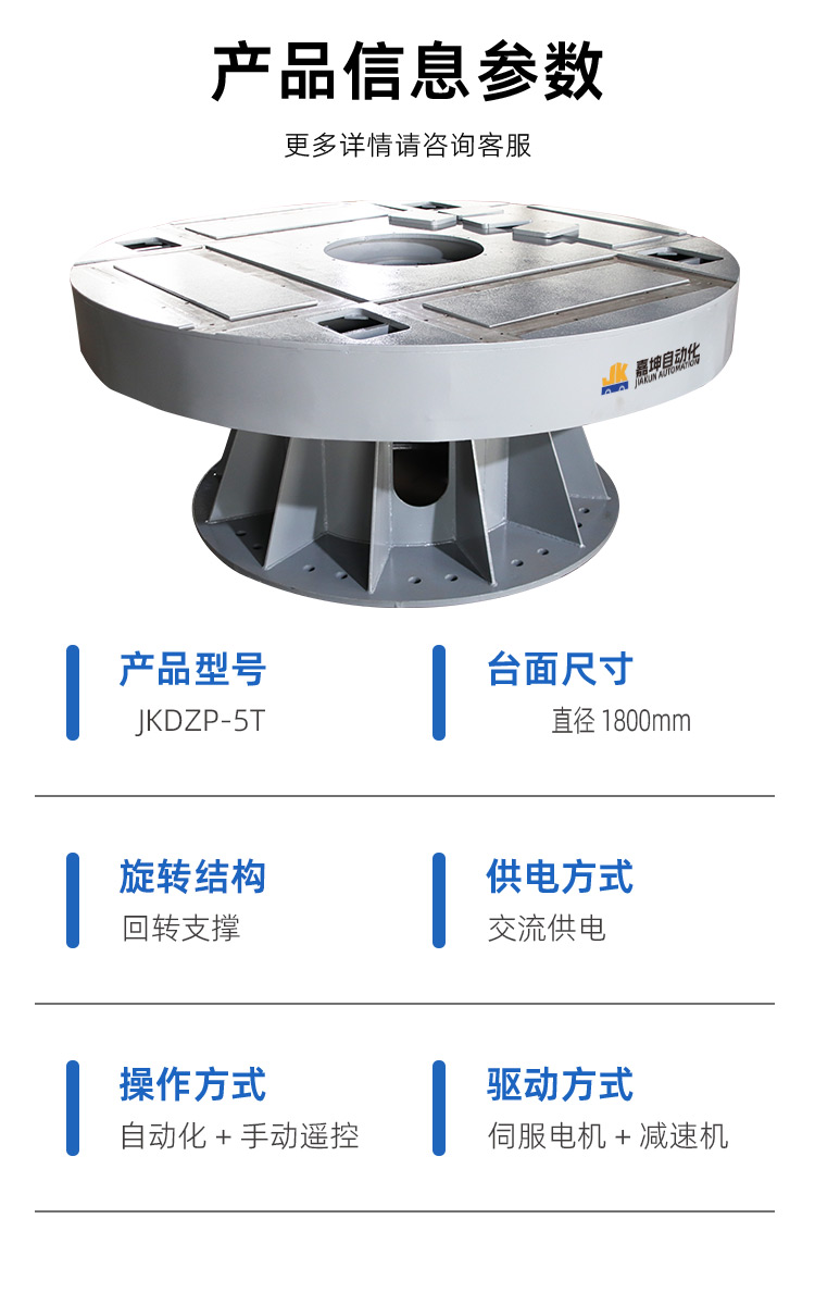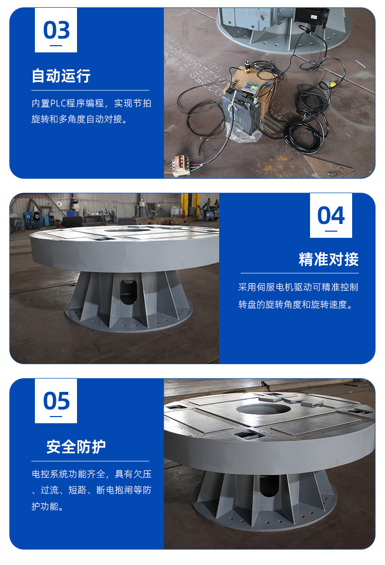 直径1.8米,承重5吨。客户用来旋转工件进行装配作业。采用伺服电机驱动可精准控制转盘的旋转角度和旋转速度。交流电驱动可长时间不间断作业。